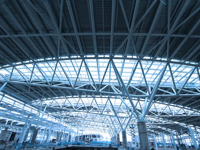 5. రూఫింగ్ మరియు బాహ్య క్లాడింగ్ ఉక్కు ఫ్రేమ్ పూర్తయిన తర్వాత, రూఫింగ్ వ్యవస్థ వ్యవస్థాపించబడుతుంది, సాధారణంగా ఇన్సులేటెడ్ మెటల్ ప్యానెల్లు లేదా సింగిల్-ప్లై మెమ్బ్రేన్ మెటీరియల్స్ ఉపయోగించి. బాహ్య గోడలు, రూపకల్పనలో చేర్చినట్లయితే, మెటల్ ప్యానెల్లు, ఇటుక లేదా ఇతర క్లాడింగ్ పదార్థాలను ఉపయోగించి కూడా ఇన్స్టాల్ చేయబడతాయి.