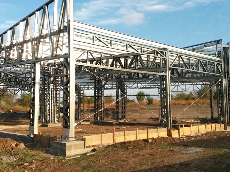 4. స్టీల్ స్ట్రక్చర్ ఇన్స్టాలేషన్ ముందుగా తయారుచేసిన ఉక్కు భాగాలు నిర్మాణ ప్రదేశానికి రవాణా చేయబడతాయి మరియు క్రేన్లు మరియు ఇతర భారీ పరికరాలను ఉపయోగించి సమీకరించబడతాయి. సంస్థాపన ప్రక్రియ పునాదికి నిలువు వరుసలను నిలబెట్టడం మరియు లంగరు వేయడంతో ప్రారంభమవుతుంది, తర్వాత గిడ్డంగి ఫ్రేమ్ను రూపొందించడానికి కిరణాలను వ్యవస్థాపించడం. రూఫింగ్ వ్యవస్థకు మద్దతుగా రూఫ్ ట్రస్సులు సురక్షితంగా ఉంటాయి.