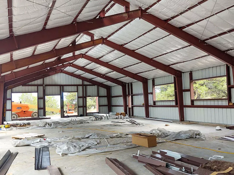 రూఫింగ్ మరియు బాహ్య క్లాడింగ్:ఉక్కు ఫ్రేమ్ పూర్తయిన తర్వాత, రూఫింగ్ వ్యవస్థ వ్యవస్థాపించబడుతుంది, సాధారణంగా ఇన్సులేటెడ్ మెటల్ ప్యానెల్లు లేదా సింగిల్-ప్లై మెమ్బ్రేన్ పదార్థాలు ఉంటాయి. బాహ్య గోడలు, డిజైన్‌లో చేర్చబడితే, మెటల్ ప్యానెల్లు లేదా ఇటుక వంటి పదార్థాలను ఉపయోగించి కూడా వ్యవస్థాపించబడతాయి.